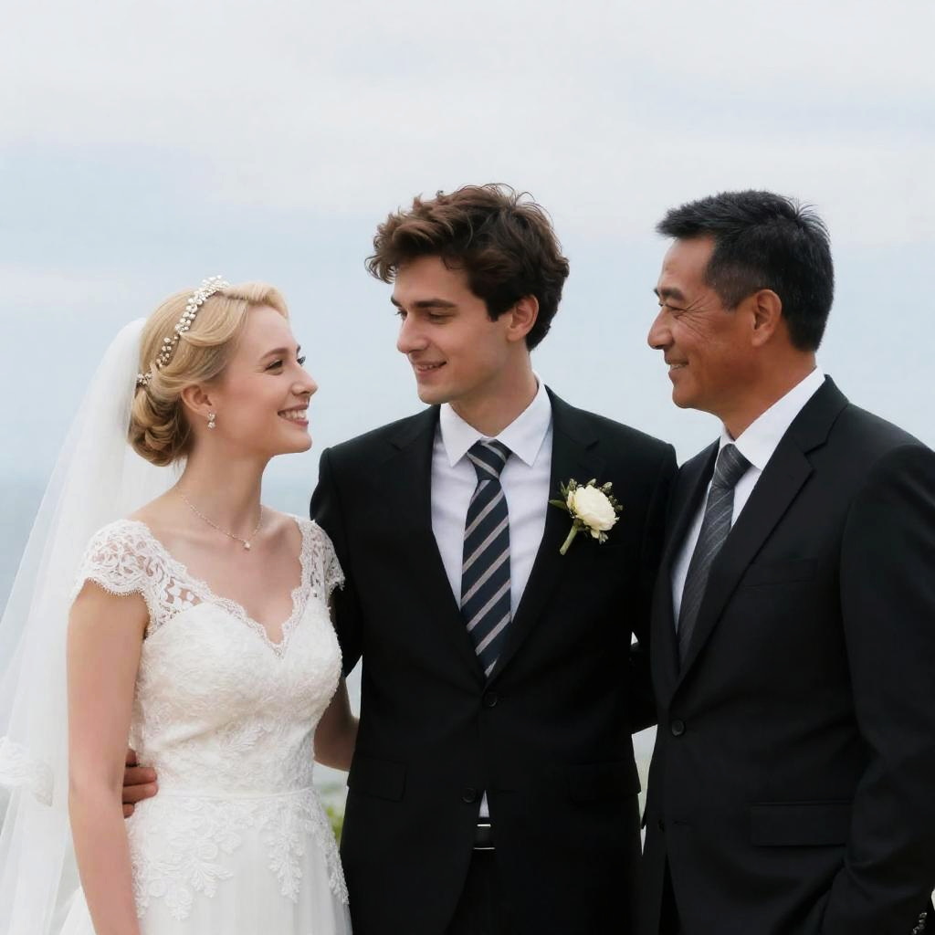 Photograph of a wedding. Three people: a smiling blonde bride in a white lace dress and veil, a young man with dark hair in a black suit and striped tie, and an older man with dark hair in a black suit. They stand close, looking at each other with joy. Soft blue sky with clouds in the background.
