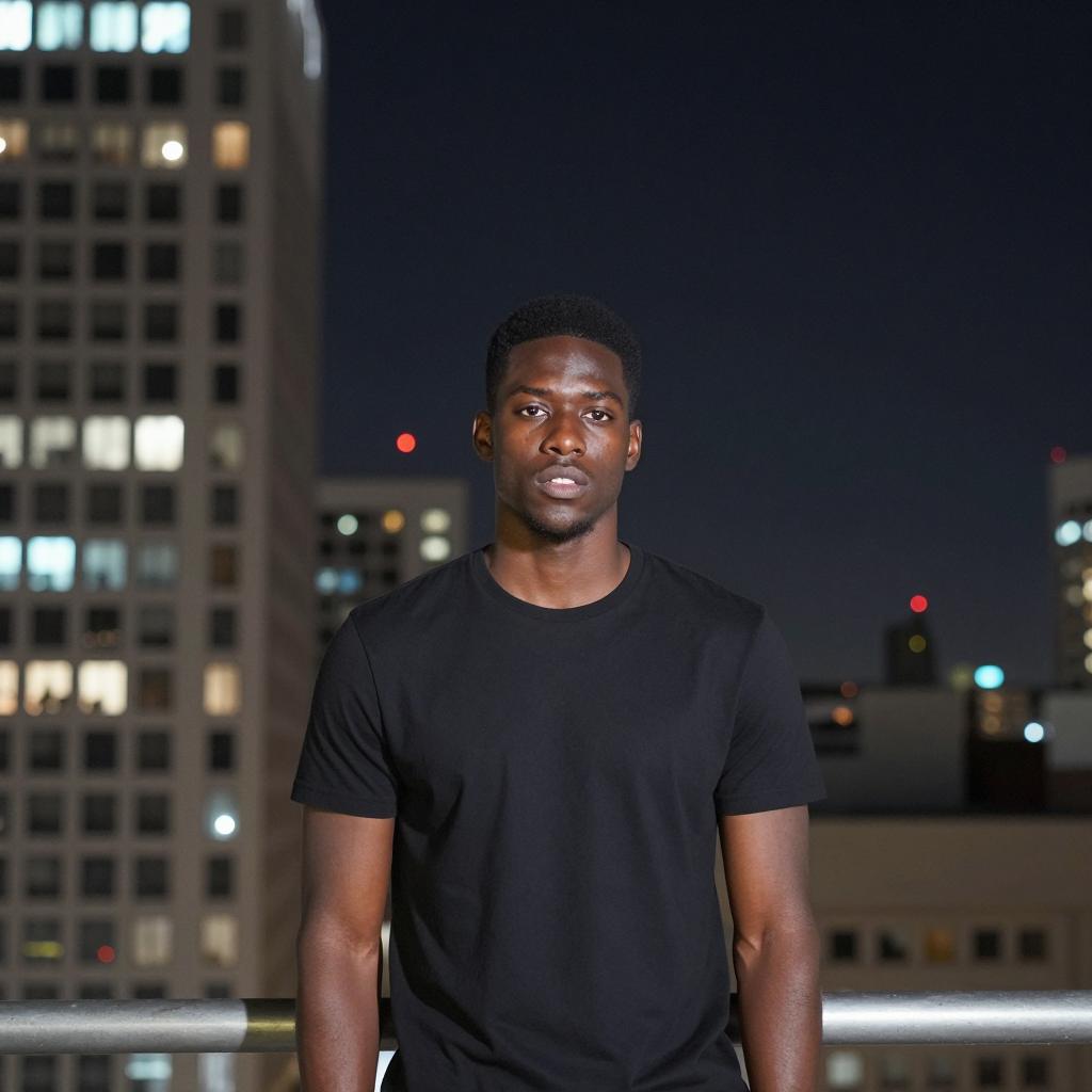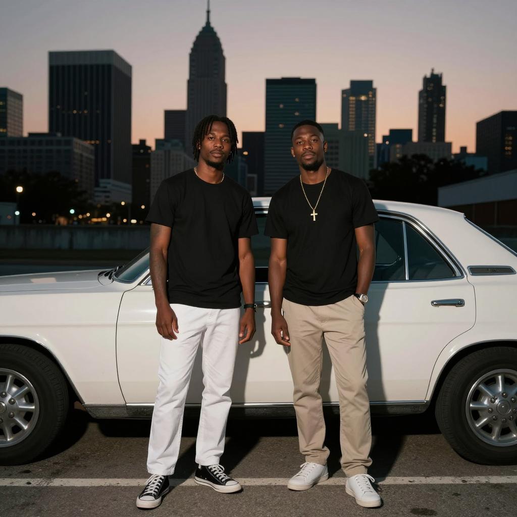 Two African American men in front of a gray brick building. Central man in blue shirt, gold cross necklace, short curly hair, intense expression. Right man in white shirt, long dreadlocks, slight smile. Six other men in background, some wearing hats. Windows and doors on building.