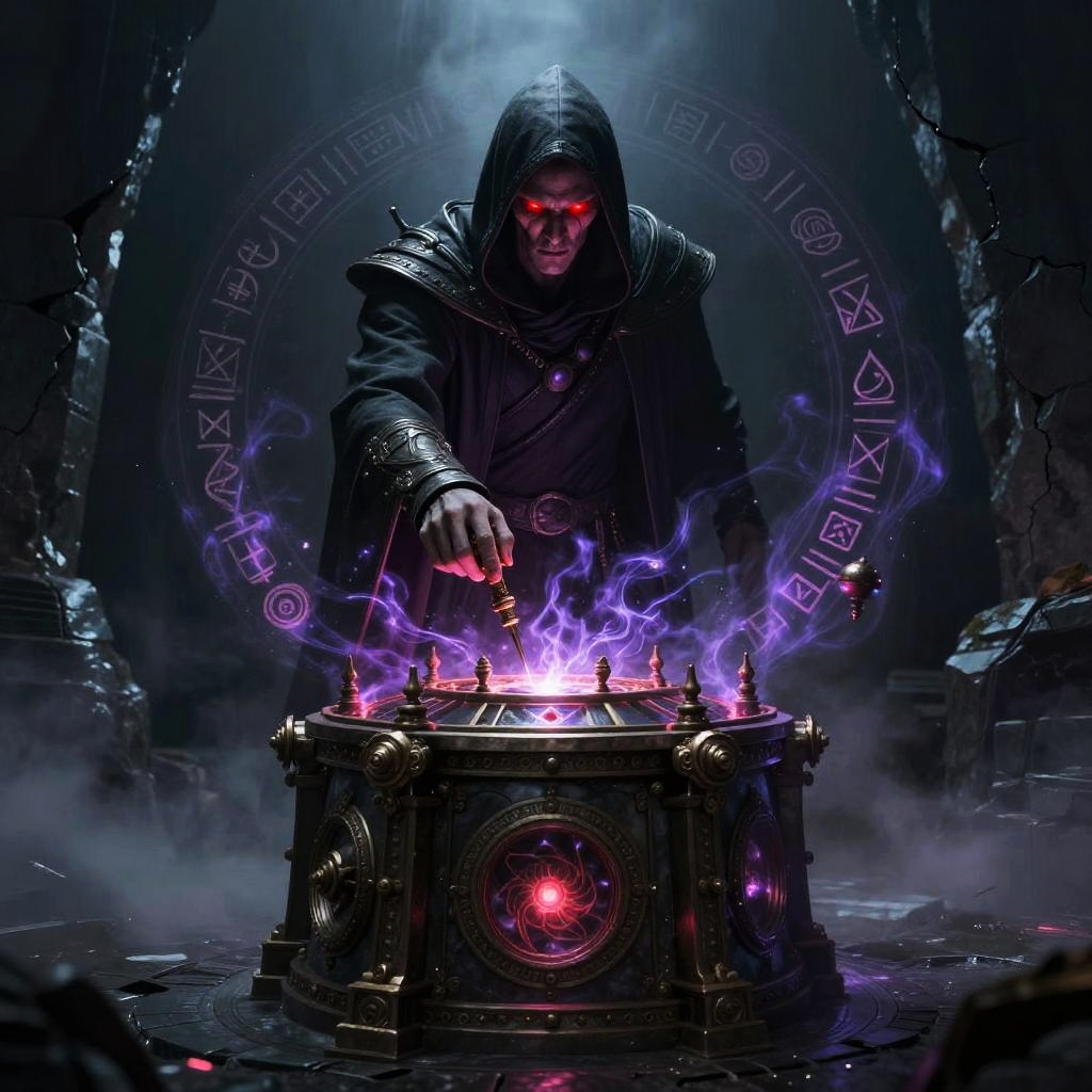Villain maker machine, an ancient mystical device surrounded by floating runes and dark energy, a hooded figure activating it with glowing red eyes, eerie atmosphere with swirling mist and cracked stone walls, fantasy dark magic theme