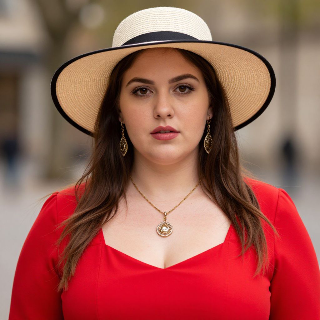 Photograph of a young woman with light skin, brown eyes, wearing a white and black wide-brimmed hat, red dress, gold necklace,
