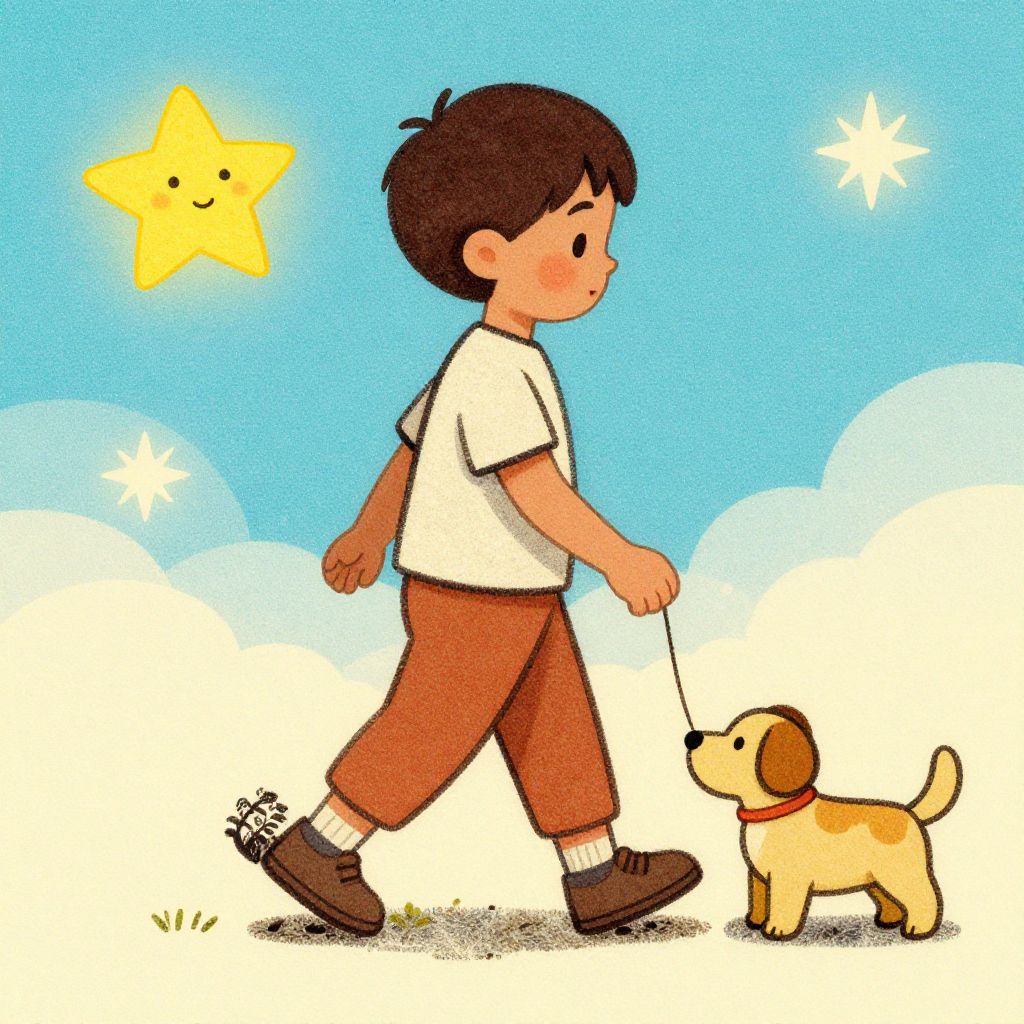 A colorful digital drawing of a young boy with short brown hair, wearing a white t-shirt, brown pants, and black shoes, walking a small yellow and brown dog on a leash. The boy is looking to the right, and the dog looks forward. The background is a bright blue sky with white clouds and two glowing yellow stars, one with a smiling face. The scene is playful and whimsical, with a textured, grainy effect adding a vintage feel. The boy and dog are positioned slightly to the left, with the stars and clouds filling the right side.