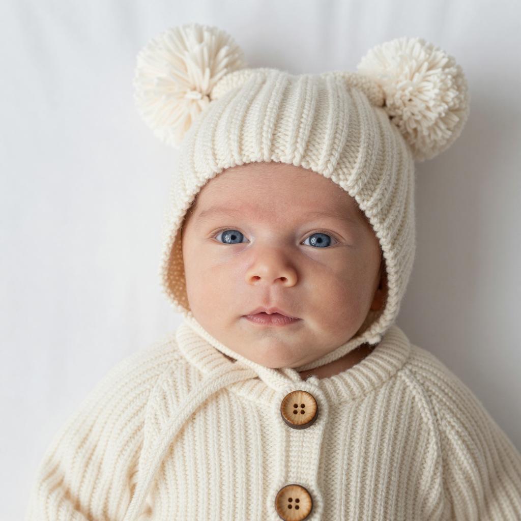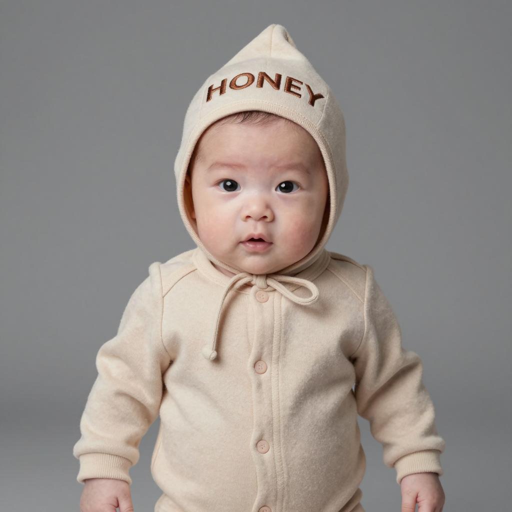 Close-up portrait of a baby with medium brown skin and short black hair wearing a green jacket with yellow pom-pom trim resembling corn kernels. The outfit includes a hood and yellow buttons, set against a plain beige background with soft, natural lighting. The baby has big round dark eyes and a neutral expression, standing indoors in a casual setting.