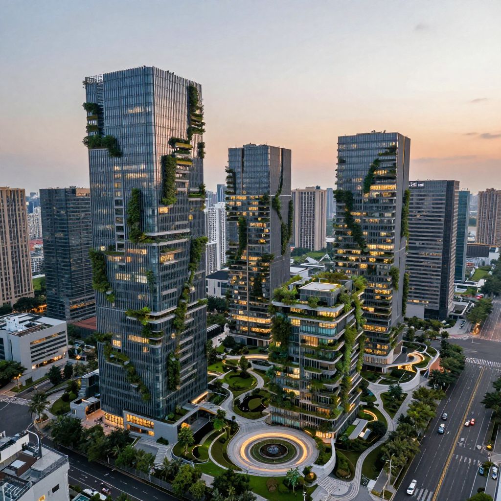 Photograph of a modern urban skyline at sunset, featuring several towering glass skyscrapers with greenery integrated into their design. The buildings have reflective glass facades, with illuminated windows creating a warm glow. The central building has a unique, zigzagging structure. A circular, landscaped courtyard with a central fountain is visible at the bottom center. Surrounding the skyscrapers are smaller buildings and a busy street with cars. The sky is a gradient of blue to orange, indicating the setting sun. The overall scene is vibrant and futuristic, showcasing a blend of nature and urban architecture.