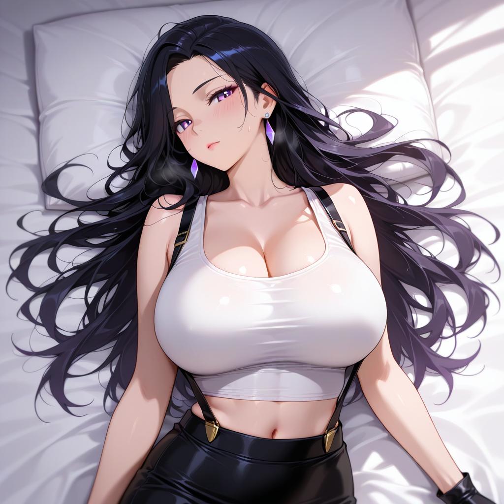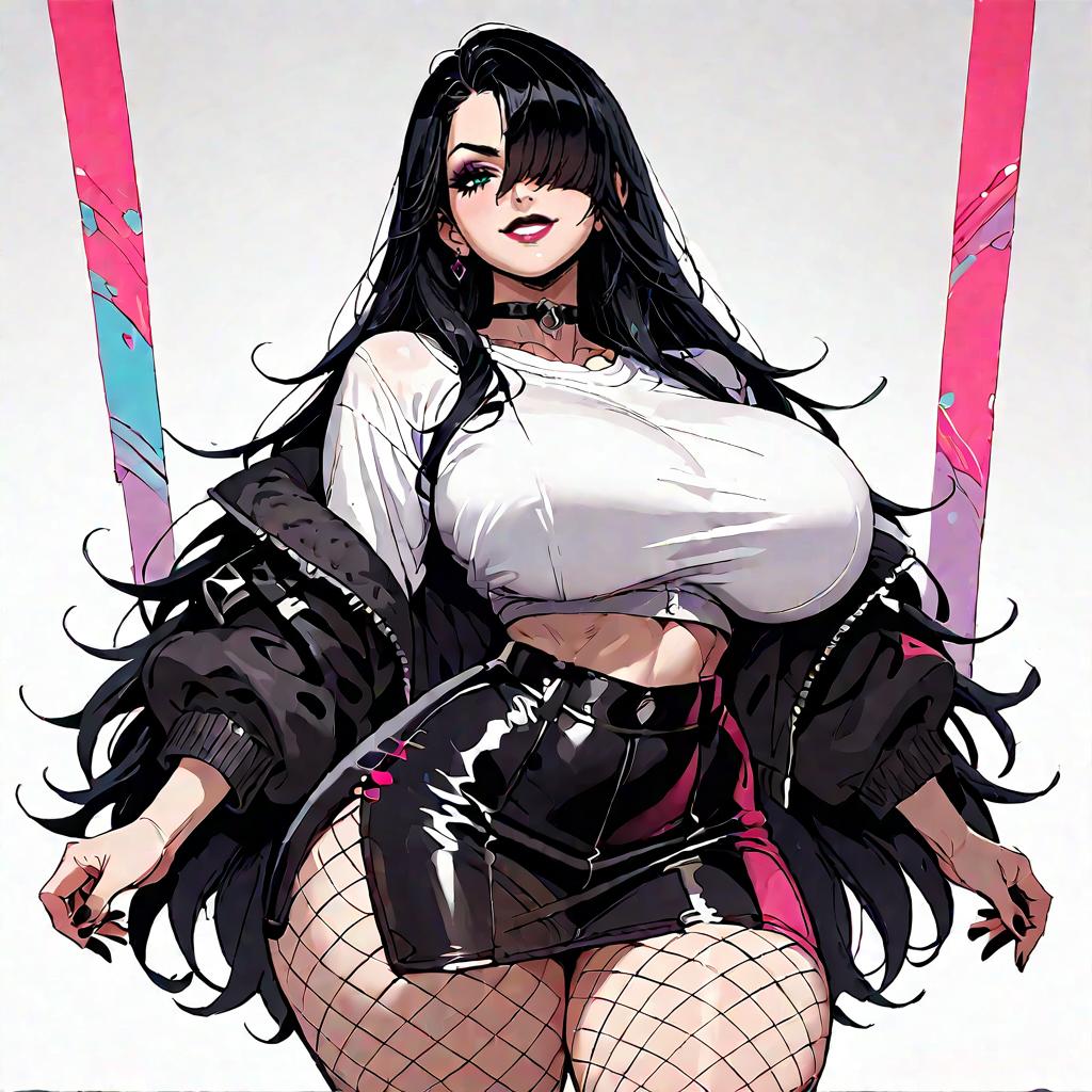 1girl, female, very long hair, hair covering left eye, straight black hair, huge breasts, wide hips, thick thighs, tight clothes, cropped jacket, skirt, goth, choker, nightclub background, smile, fishnets, white top 2d score_9, score_8_up, score_7_up, score_6_up, source_cartoon