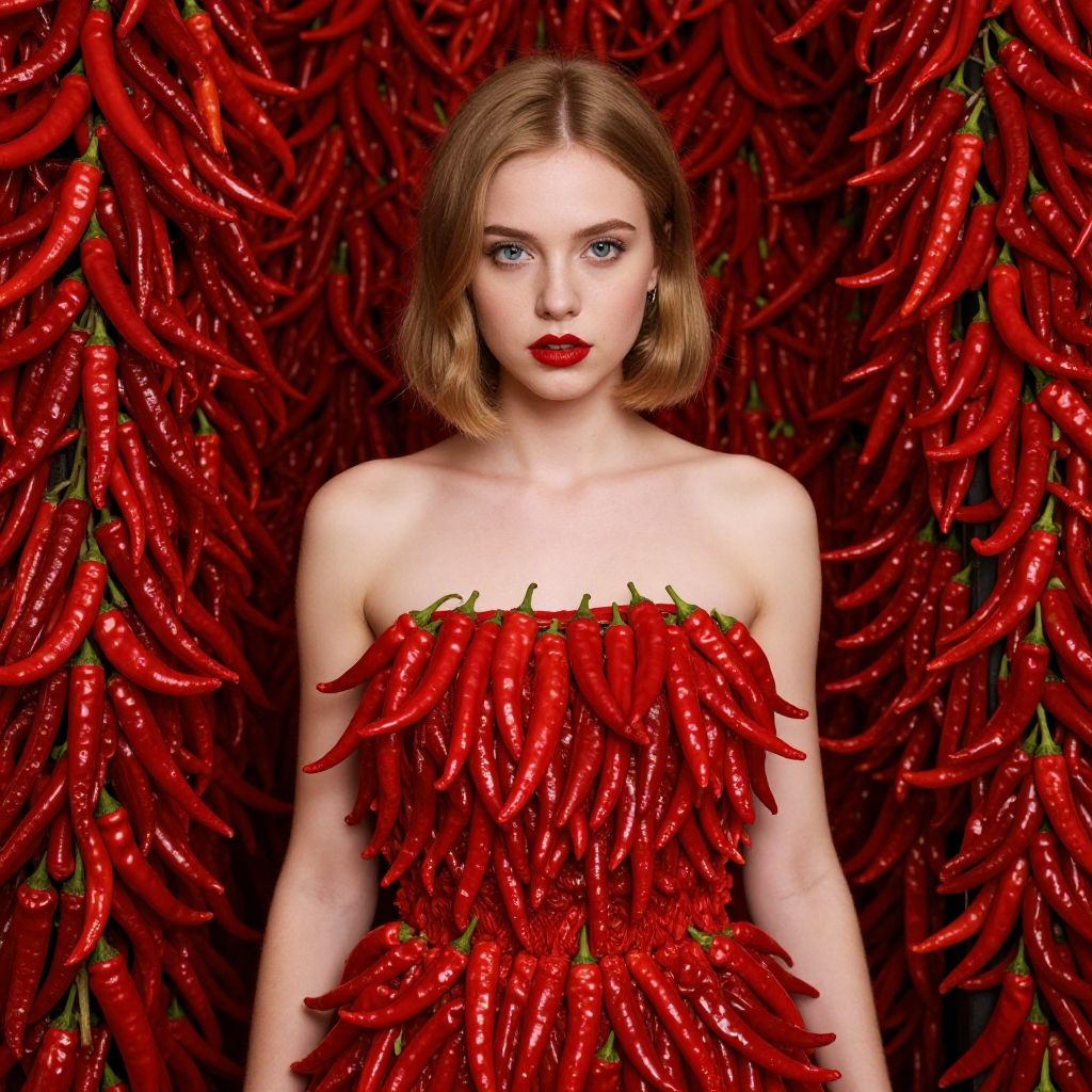 A young woman with light skin and short blonde hair is surrounded by and dressed in numerous vibrant red chili peppers. She wears a strapless dress crafted entirely from red chili peppers, set against a backdrop densely covered with the same peppers. She has red lipstick matching the peppers and striking blue eyes.