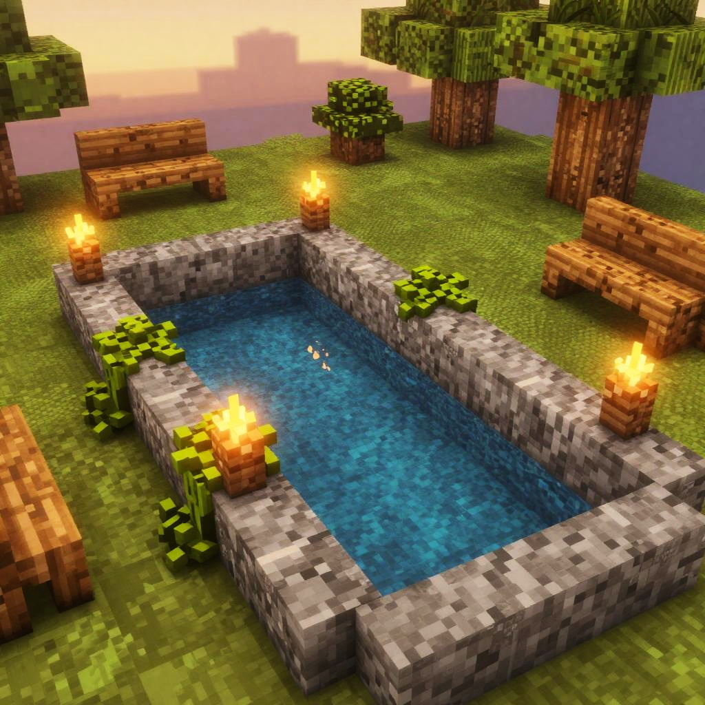 Pool ideas Minecraft: creative medieval stone pool with torches and vines, surrounded by cobblestone paths and wooden benches, sunset lighting, highly detailed texture