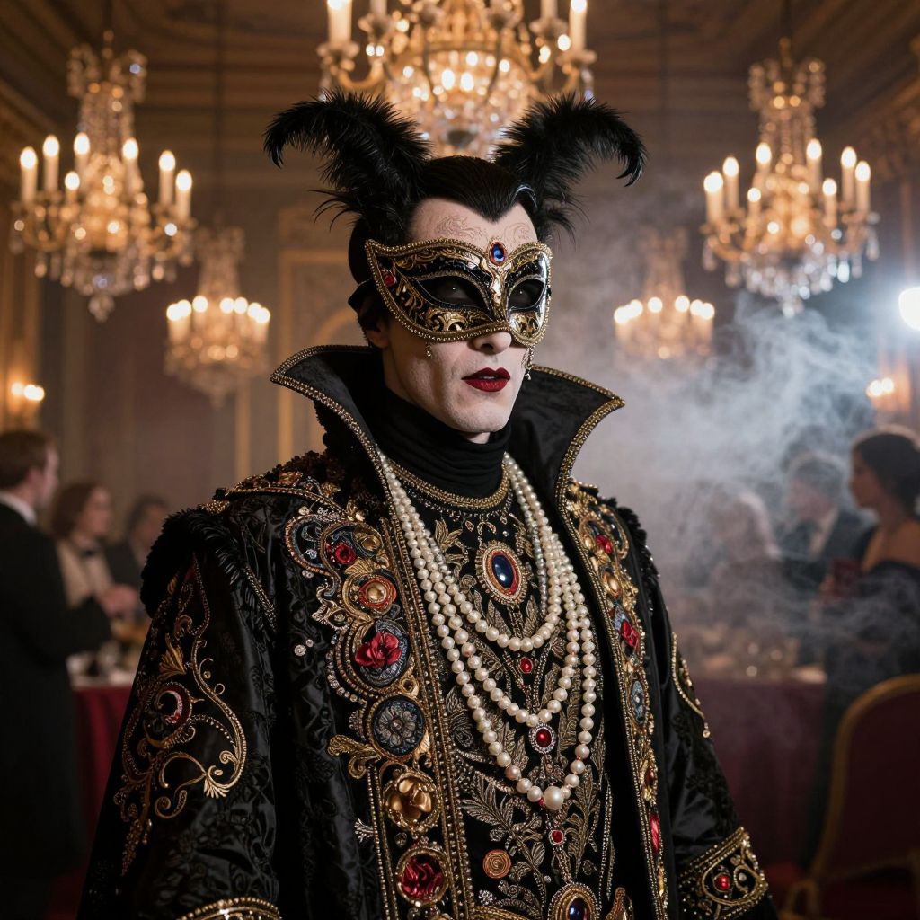 Photograph of a person in an elaborate, Victorian-style masquerade costume. They wear a black, heavily embroidered robe adorned with gold, red, and pearl details, a high-collared black shirt, and a black masquerade mask with gold accents and black feathered headpiece. Their pale face is painted white with red lips, and they have dark, dramatic makeup. Smoke wafts around them, adding a mysterious atmosphere. The background features a lavish room with multiple lit chandeliers, and blurred figures seated at tables, suggesting a formal, opulent event. The overall style is dramatic and theatrical.