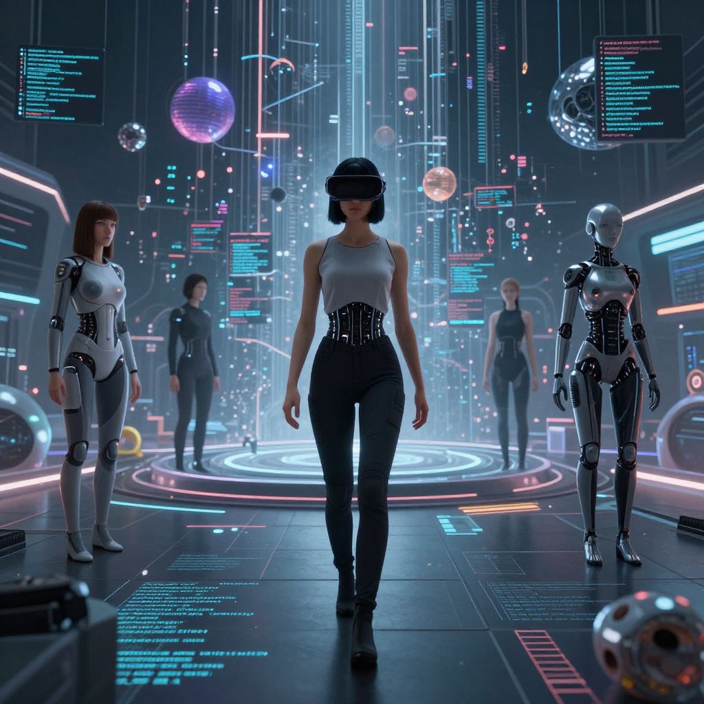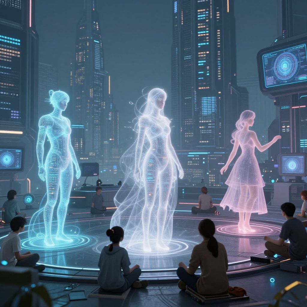 AI characters in video games envisioned as ethereal entities made of light and code, interacting with human players in a sprawling virtual metropolis, combining surreal visuals with cutting-edge technology, rendered in a detailed sci-fi fantasy art style.
