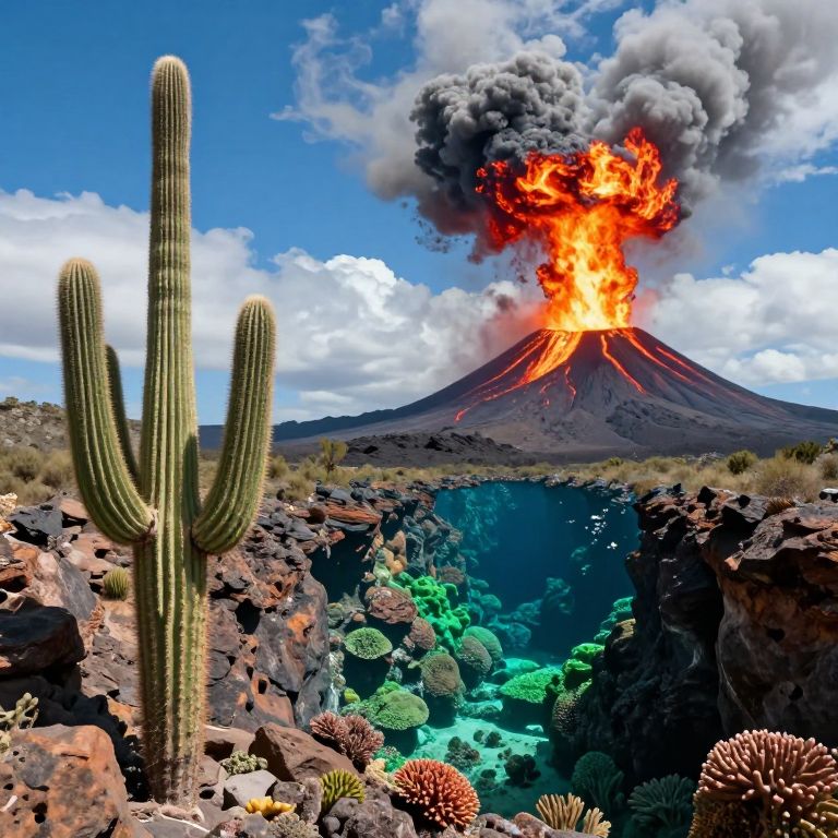 A surreal landscape juxtaposes a towering saguaro cactus on rocky terrain to the left, a vibrant underwater canyon teeming with green coral formations below, and a fiery volcanic eruption rising dramatically in the distance to the right, all under a clear blue sky dotted with fluffy clouds.