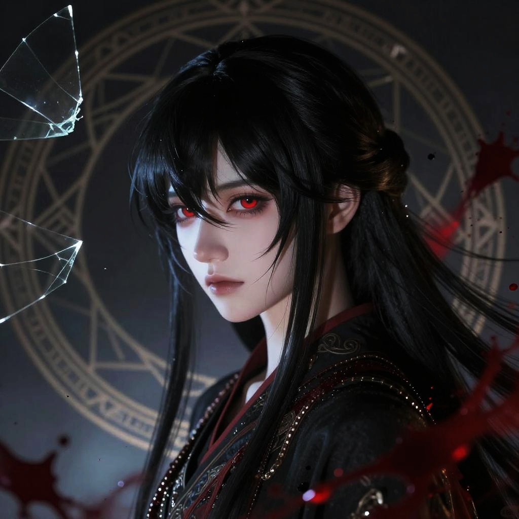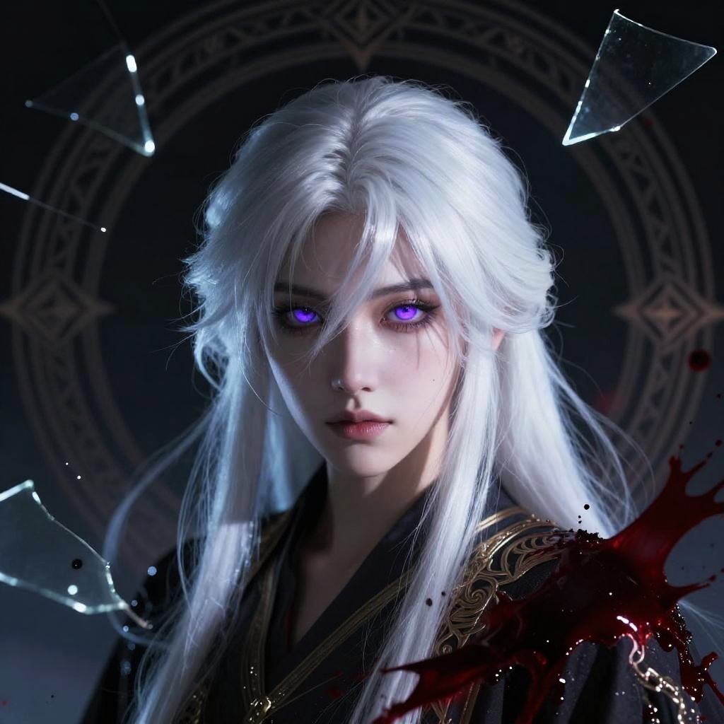 (masterpiece, best quality, ultra-detailed, best shadow), (detailed background, dark fantasy), (beautiful detailed face), high contrast, (best illumination, an extremely delicate and beautiful), ((cinematic light)), colorful, hyper detail, dramatic light, intricate details, (1girl, solo, white hair, sharp face, purple eyes, hair between eyes, dynamic angle), blood splatter, swirling black light around the character, depth of field, black light particles, (broken glass), magic circle