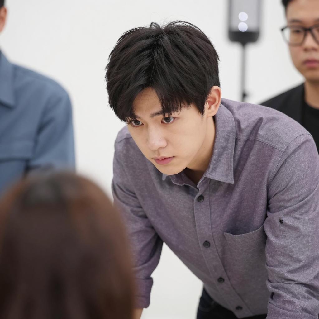 Young Asian man with short black hair, wearing a gray and purple button-up shirt, leans forward, looking intently at another person with brown hair. Two other people are partially visible in the background, one in blue and gray, the other wearing glasses. Bright indoor setting with a shiny object hanging in the background.