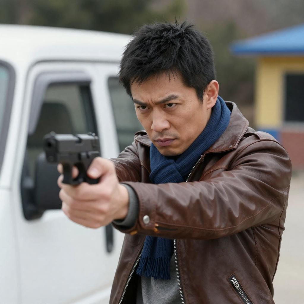 Man with short black hair, intense expression, arms raised and bound to a dark arch, wearing black leather jacket and gray pants, red belt, green concrete background, dim lighting.