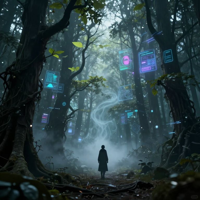 Digital artwork depicting a mystical forest scene at night. A lone, shadowy figure in a long coat stands at the forest's center, facing a glowing, misty path that winds into the distance. Tall, dark trees with neon, holographic displays float around them, emitting vibrant blues, purples, and pinks. The forest is dense with foliage, and ethereal light filters through the canopy, casting an otherworldly glow. The ground is uneven and covered with leaves and roots. The overall atmosphere is mysterious and futuristic, blending natural and technological elements.
