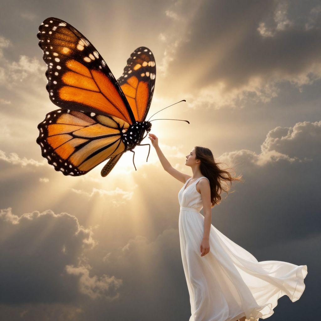 A young woman in a flowing white dress reaches out to touch a colossal monarch butterfly, its wings ablaze with vibrant orange and black patterns, defying the scale of reality against a backdrop of golden sunlight and swirling storm clouds.