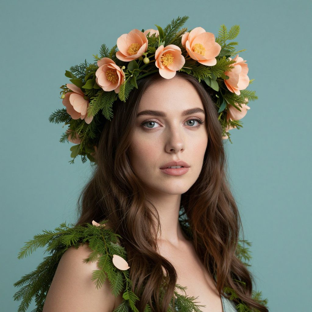 A woman stands gracefully, her shoulders adorned with a vibrant crown of peach-colored flowers and lush green foliage, their petals whispering ancient secrets against a serene teal backdrop.