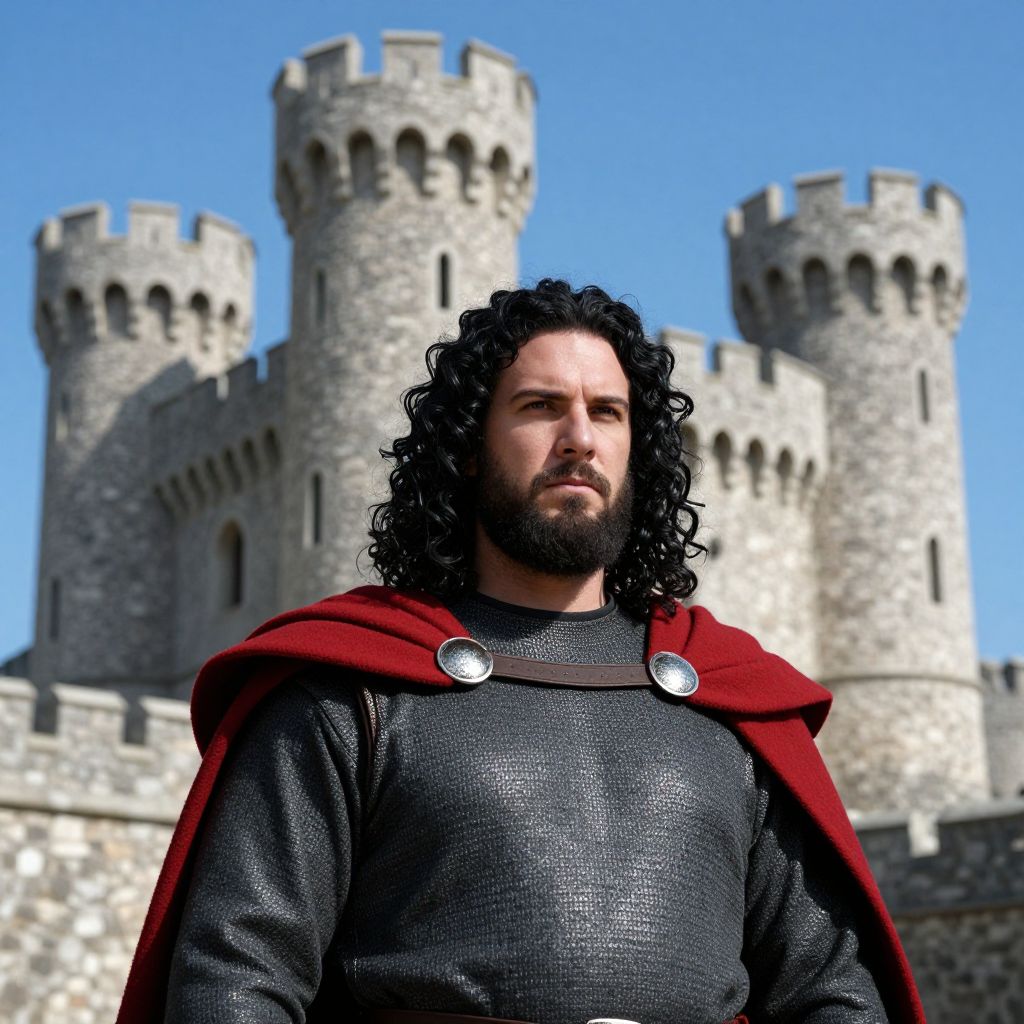 This is a CGI image of a bearded man with curly black hair, wearing a dark grey chainmail shirt and a red cape with silver clasps. He stands in front of a tall, grey stone castle with multiple cylindrical towers and crenellations against a bright blue sky. The man has a serious expression and the castle is slightly blurred in the background.