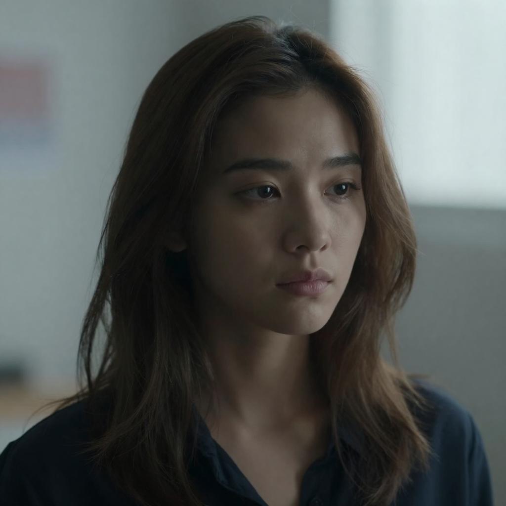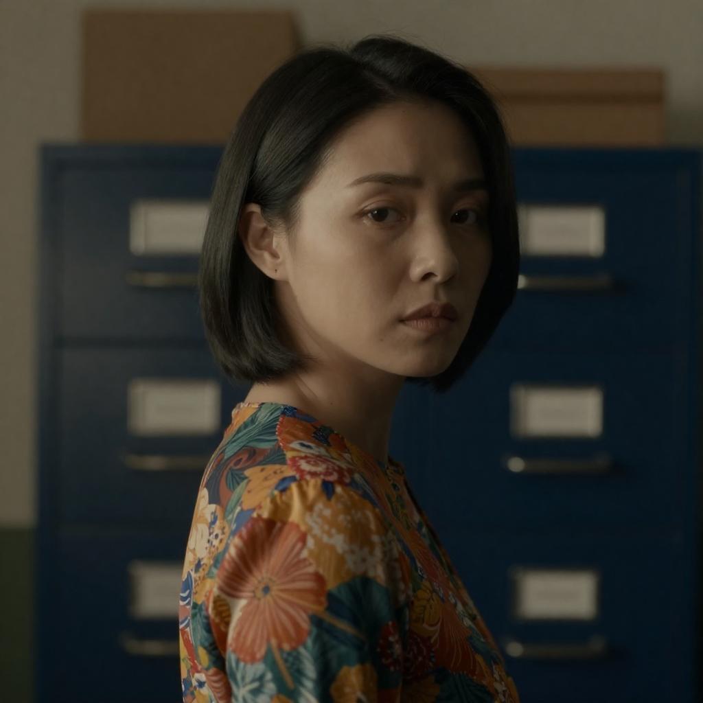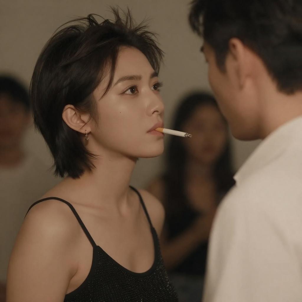 Photograph of a dark-haired woman with a serious expression, wearing a black shirt, standing in a dimly lit room. She holds a cigarette to her mouth with her right hand. A bright light source is visible in the background, creating a stark contrast. The scene has a moody, dramatic atmosphere.