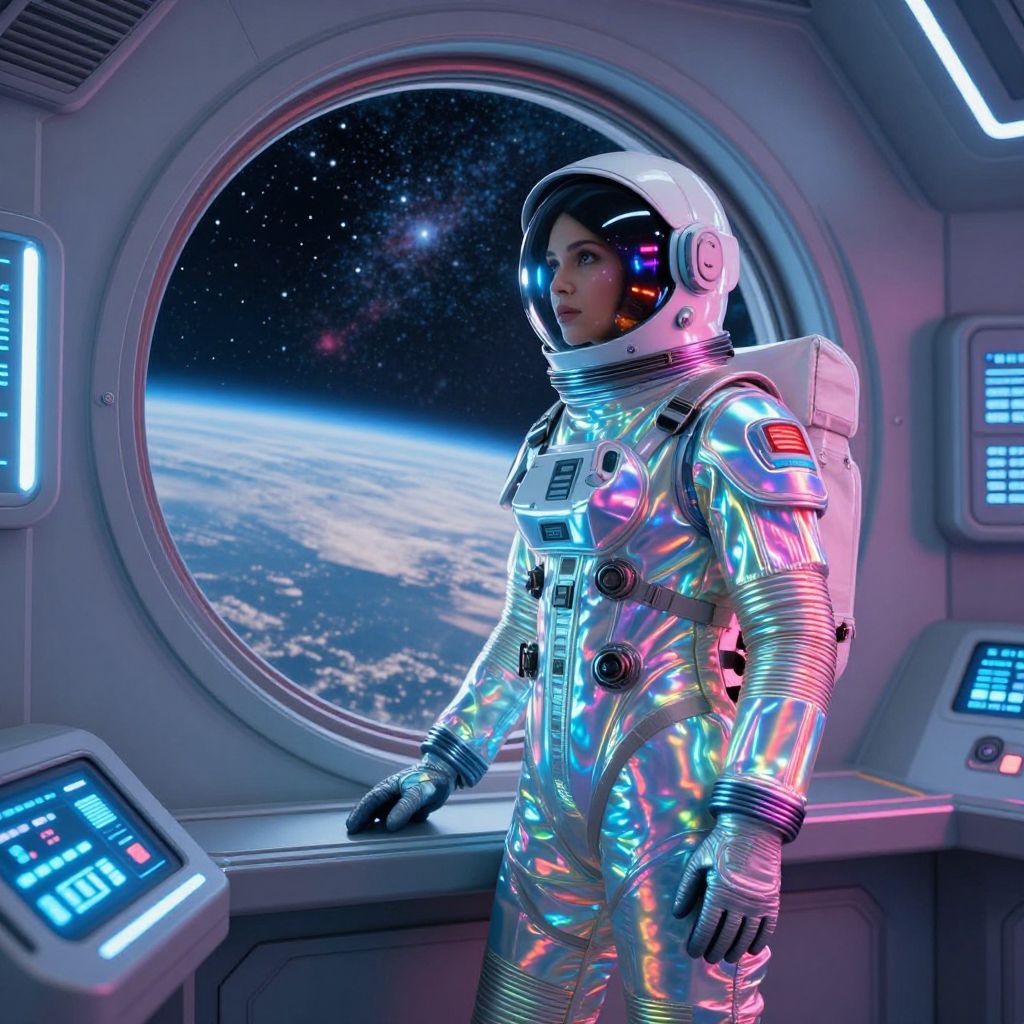 Photorealistic CGI of a woman in a shiny, multi-colored astronaut suit, standing in a spaceship cabin, gazing out at Earth and space through