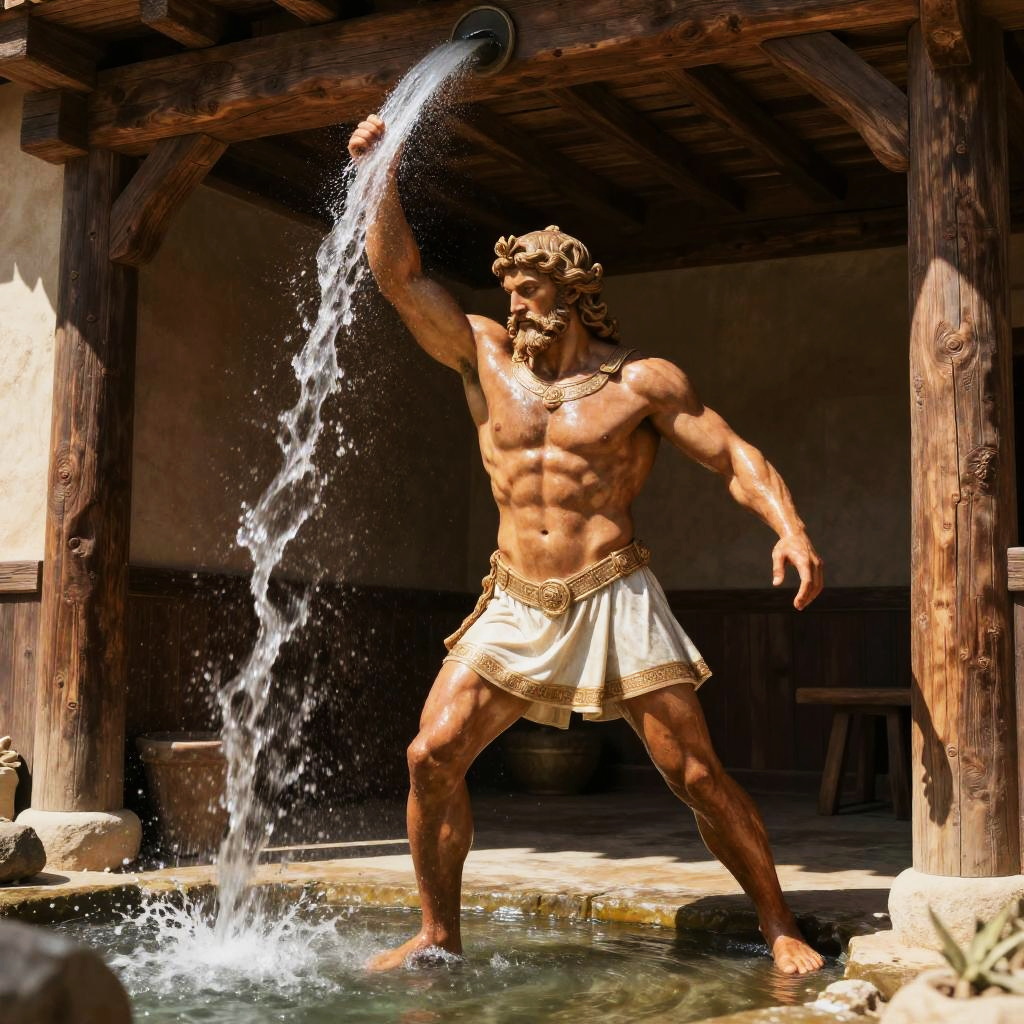 Ancient Greek hero Augeas depicted in dynamic action, controlling streams of water that flow through enormous stables to purify them, intense sunlight casting sharp shadows, intricate textures highlighting muscles and ancient wooden textures, fantasy realism with epic storytelling.
