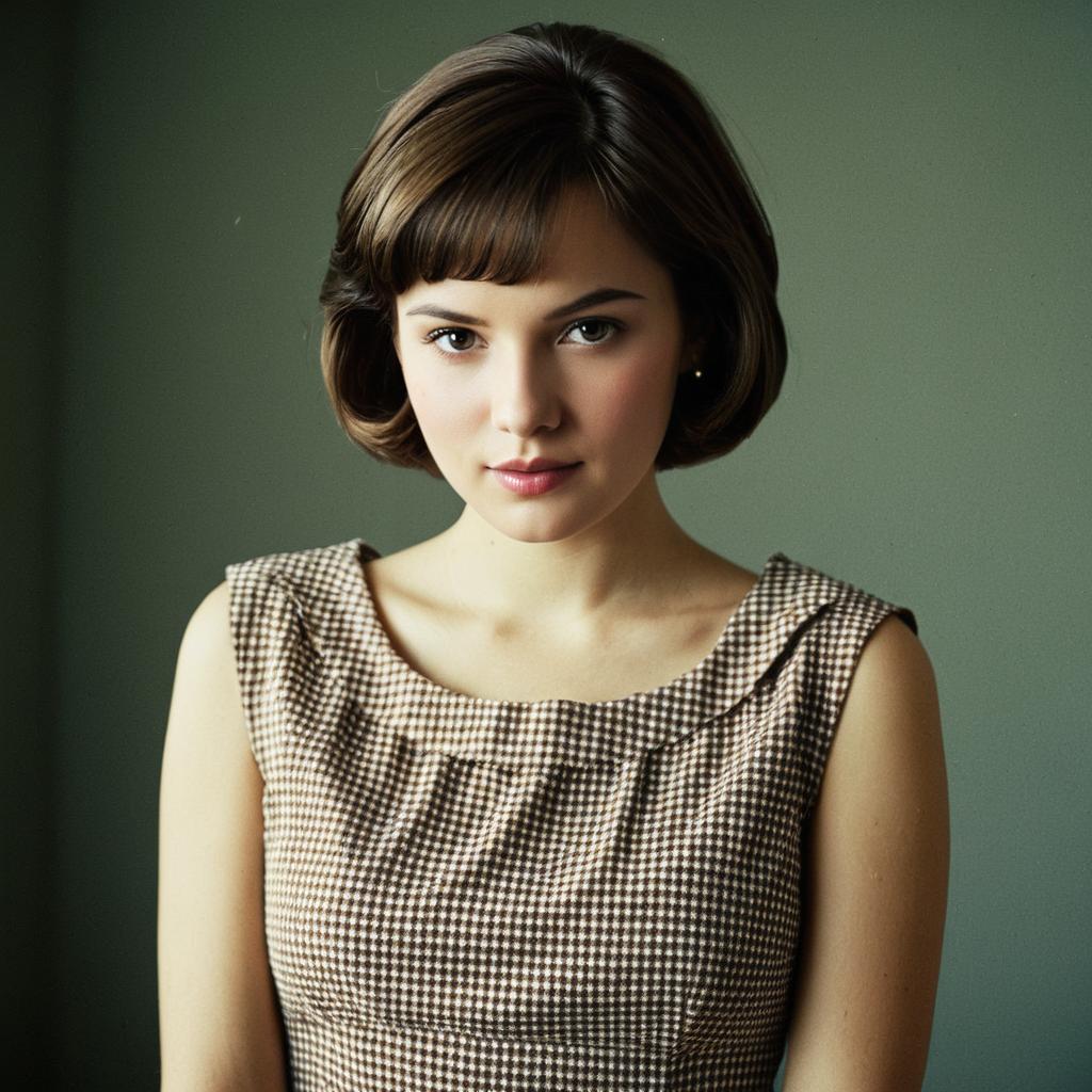 Portrait of a young Caucasian woman with brown hair styled in a large, elegant bun. She is wearing a brown dress with long, puffy Juliet sleeves and a high ruffled collar with white lace trim. The woman is facing the camera, looking directly at the viewer with a neutral expression against a muted green background.