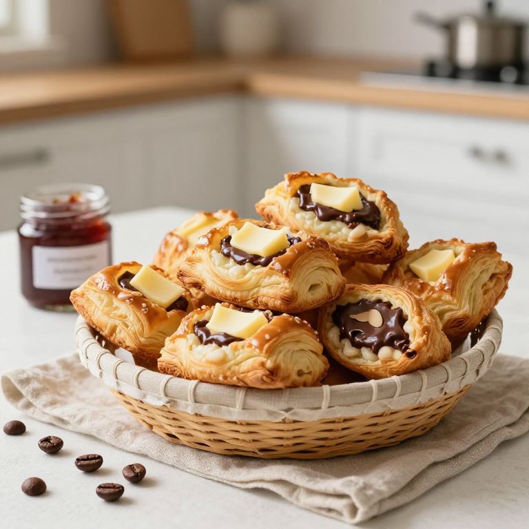 A basket of assorted cruasanes with buttery, flaky layers, some filled with chocolate and almond paste, arranged on a linen cloth with scattered coffee beans and a small jar of homemade jam, evoking a European breakfast vibe in a sunlit kitchen.
