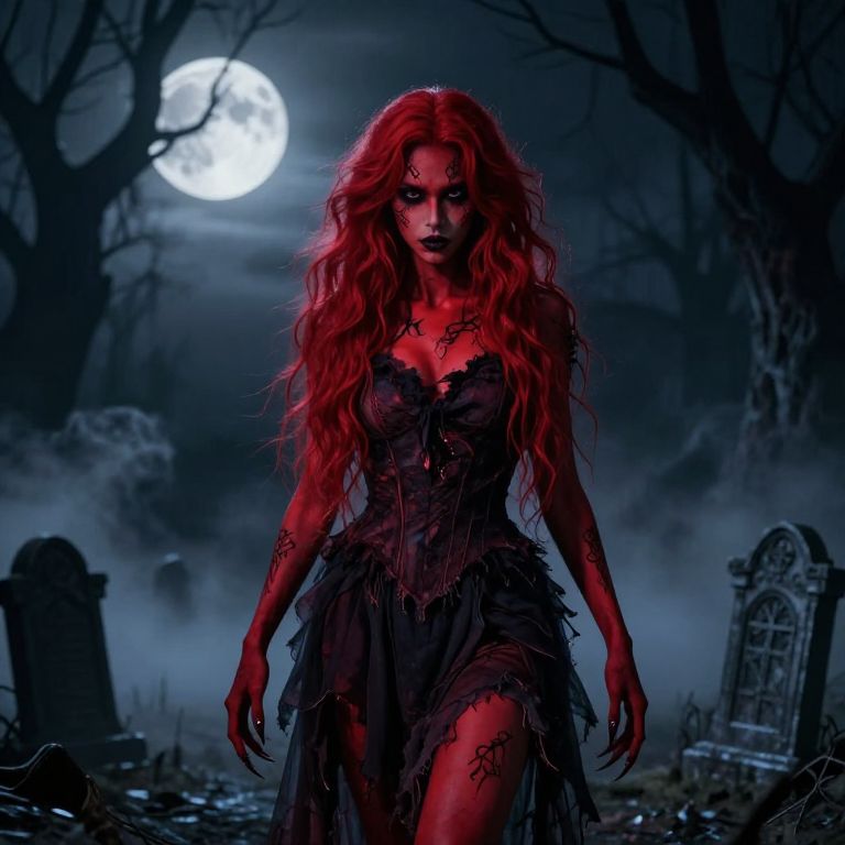 A digital artwork depicts a red-haired, pale-skinned woman with fierce, glowing eyes and intricate black tattoos on her face and body. She wears a tattered, black, strapless dress with frayed edges. The background features a dark, eerie graveyard under a full moon, with bare trees and tombstones shrouded in mist. Her long, wavy hair cascades over her shoulders, and her stance is powerful and commanding. The moonlight casts an eerie blue glow on her red hair and pale skin. The image exudes a gothic, supernatural atmosphere.
