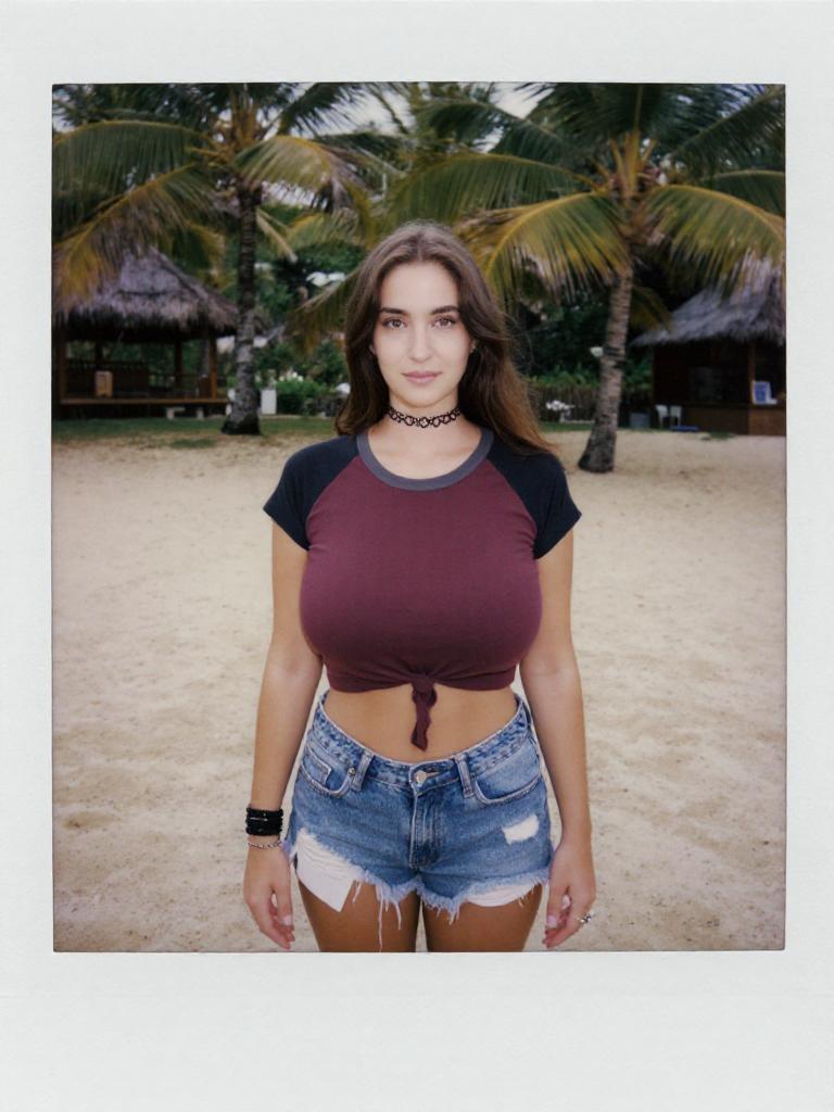 Photograph of a young woman with long brown hair standing on a sandy beach. She has light skin and a curvy physique with large breasts. She wears a tied-up, short-sleeve, maroon and black crop top and distressed, frayed denim shorts. She has a black choker necklace and a black wristband on her right wrist. The background features tall palm trees and thatched-roof huts. The image is bordered with a gray frame, and the overall style is vibrant and slightly overexposed, emphasizing the colors and textures.