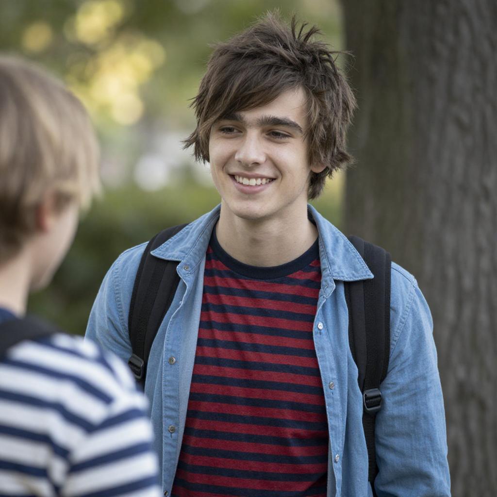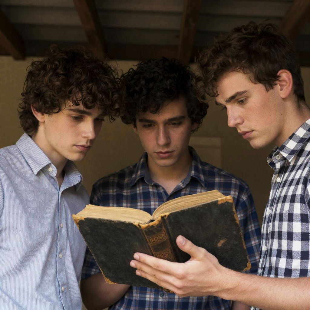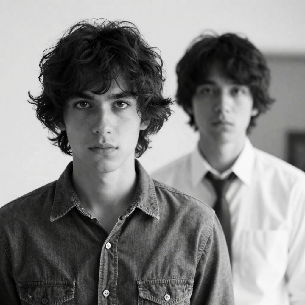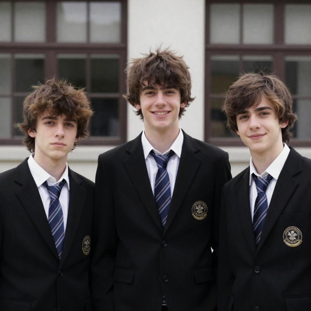 Photograph of three young men with brown shaggy hair, wearing black blazers and striped ties. Background shows a building with large windows. Middle man smiles, left man looks serious, right man smiles slightly. All three have light skin.
