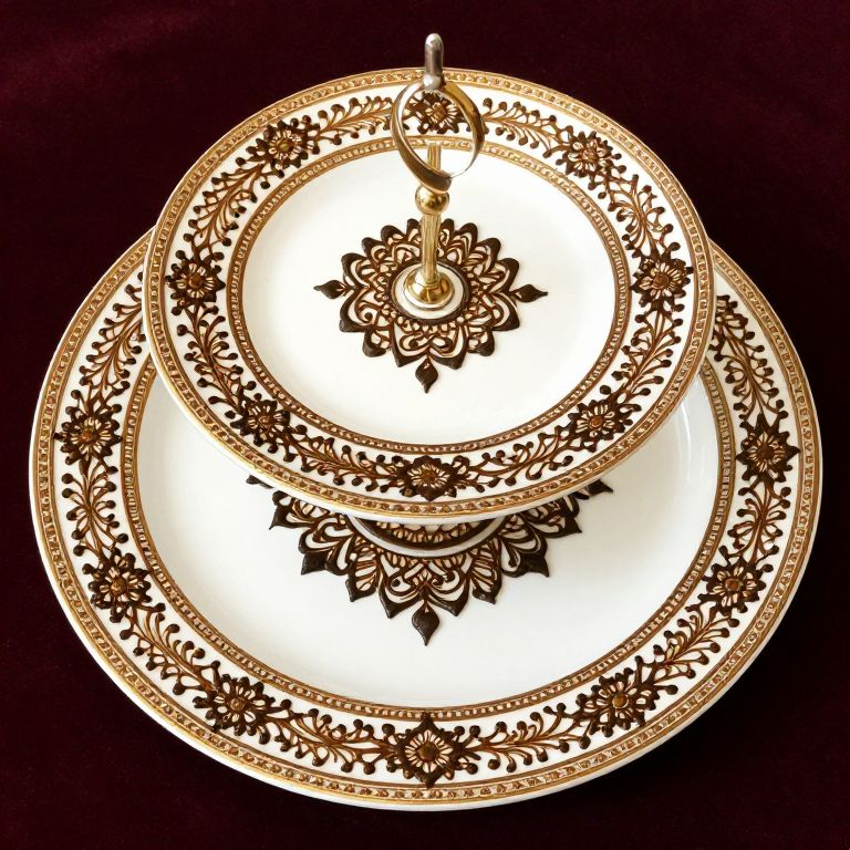 Photograph of an ornate, white porcelain dessert plate with intricate black floral and leaf patterns, stacked on itself against a black background.