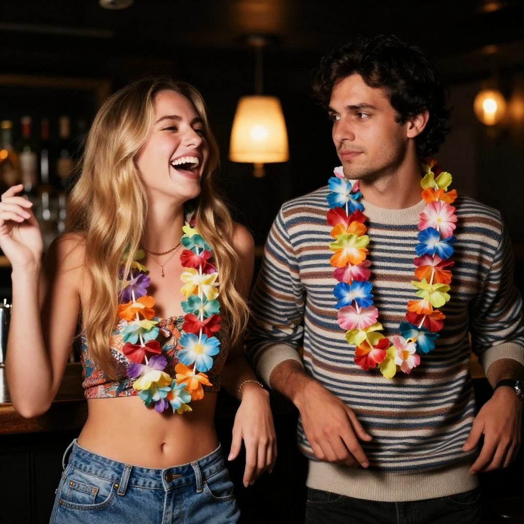 Photograph of two people sitting on a dock at night. Blonde woman with long hair, red shawl, and white shorts, holding a mug. Young man with short brown hair, wearing a colorful Hawaiian shirt and dark shorts, holding a beer can. They are smiling at each other. Background includes a dark, blurry water area and lit steps. Blue light highlights the scene. Woman on left, man on right.