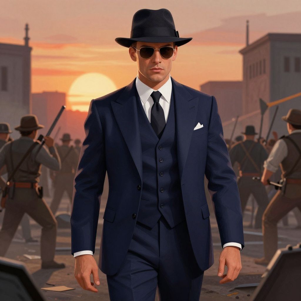 A sharply dressed man in a vintage navy blue suit and fedora hat stands confidently amidst an intense battlefield scene at sunset. The illustration captures a dramatic moment with dynamic lighting and detailed background architecture, evoking a classic noir style with a modern digital painting technique.