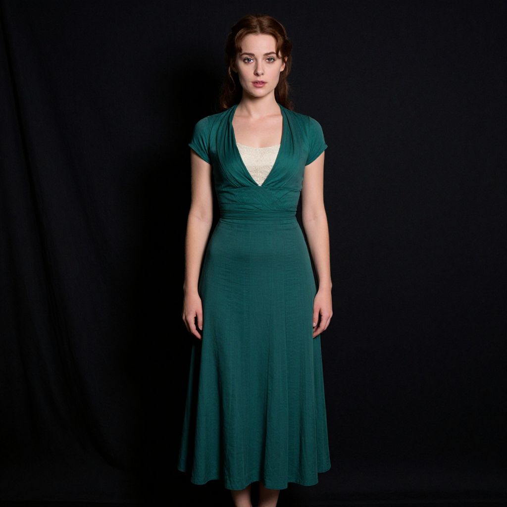 Photograph of a fair-skinned woman with brown hair, wearing a deep green, V-neck, short-sleeve dress, standing against a black