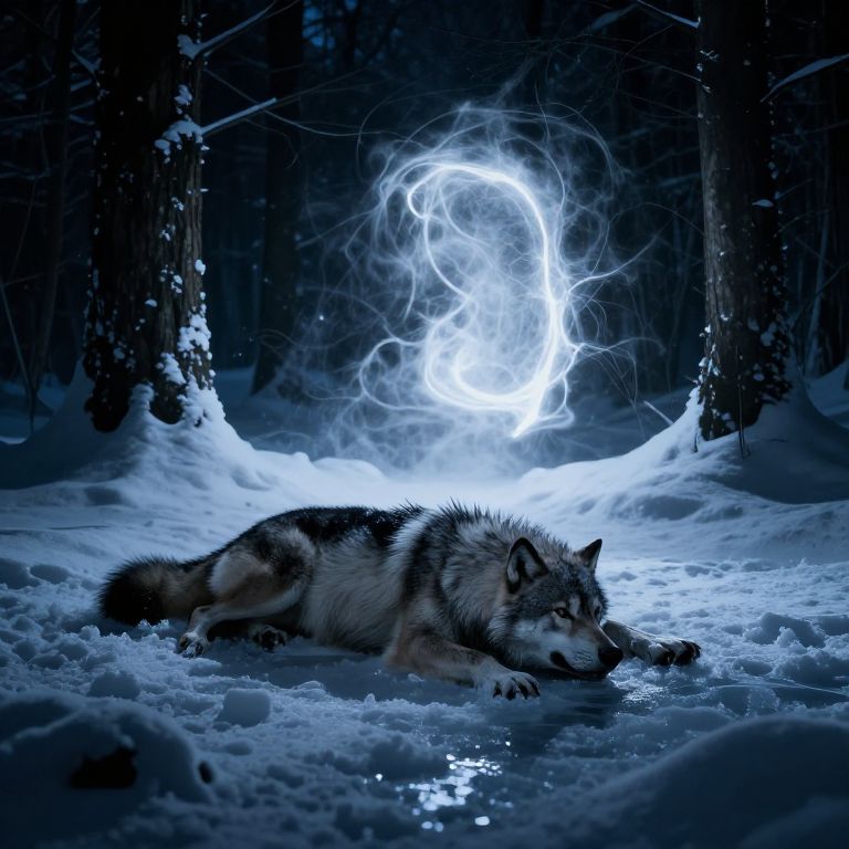Photograph of a wolf lying on snowy ground in a dark forest, illuminated by a glowing, swirling blue light in the background.