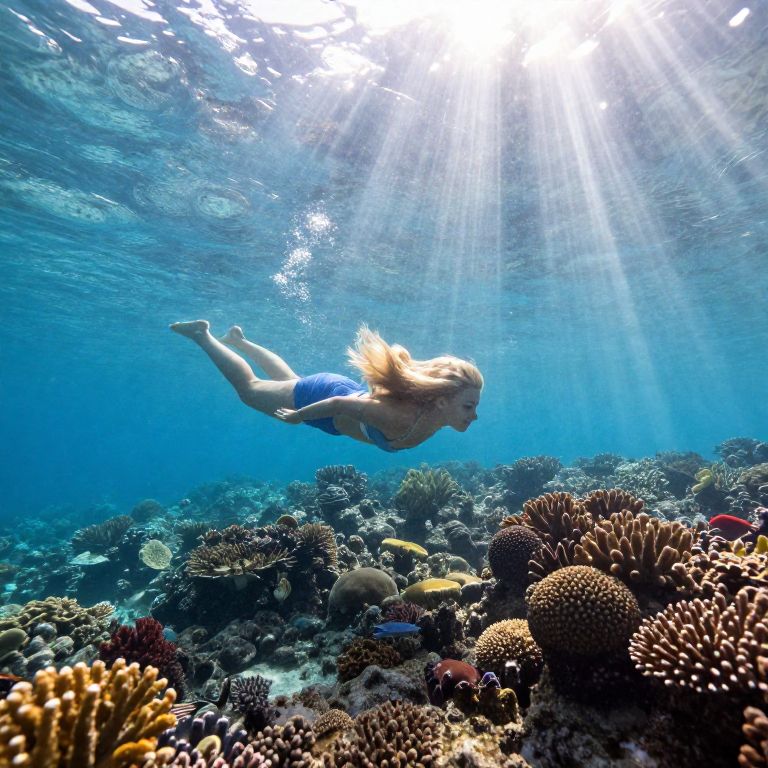 Blonde girl beach, underwater perspective with sparkling rays penetrating water, girl floating near coral reefs, vibrant marine life, ethereal and tranquil ocean environment