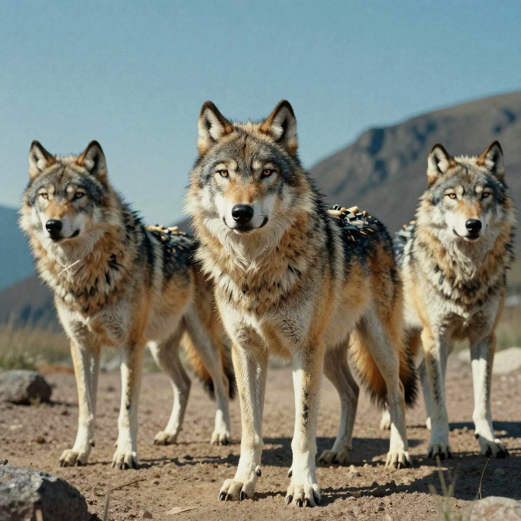 Vibrant colored cyborg wolves, in an Anscochrome analog film style, cinematic and retro, grainy texture, dynamic composition, art by Jax Jones