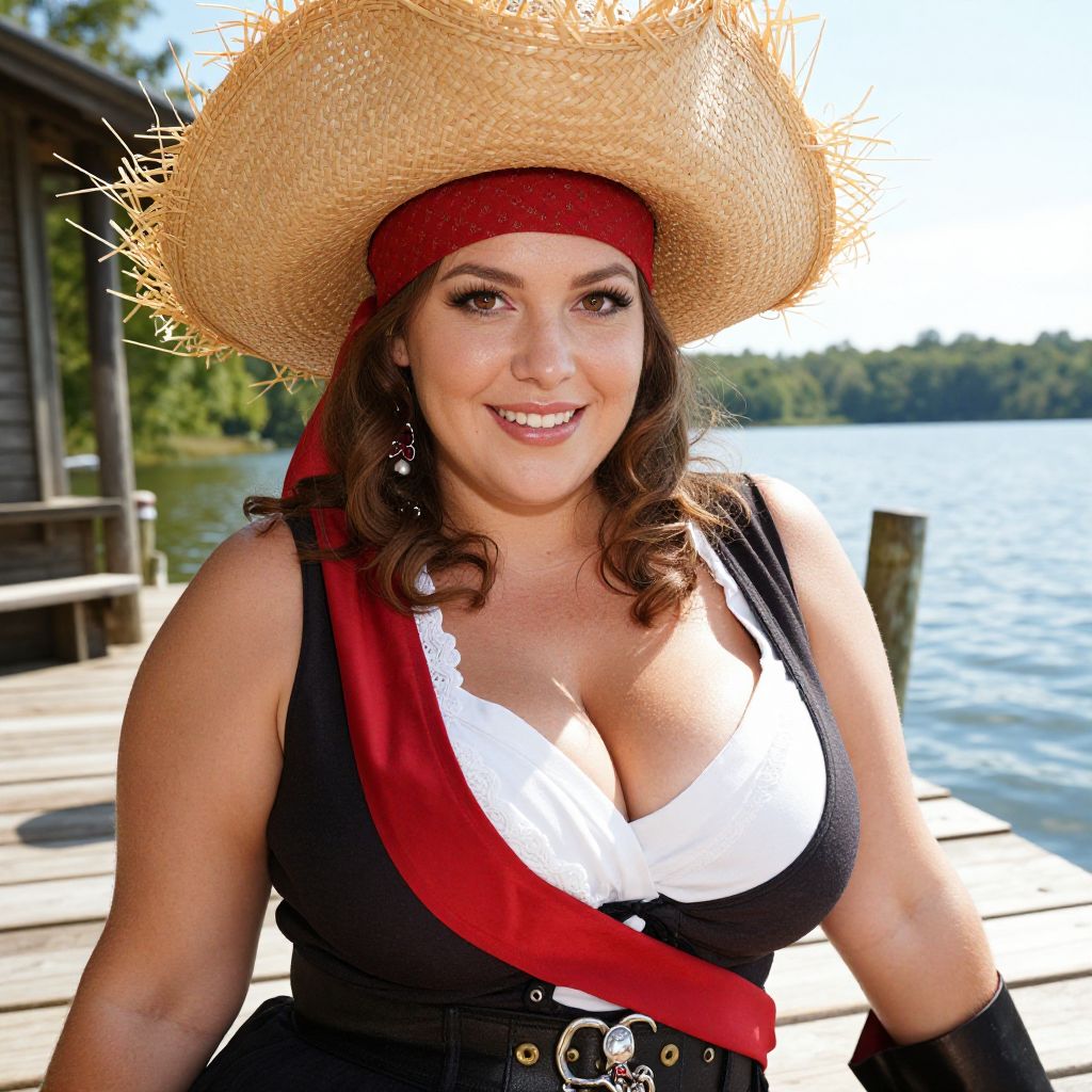 A dynamic close-up of a woman in her early 40s with soft brown eyes and a warm, joyful expression, wearing a glamorous plus-size pirate costume with a red sash and a large straw hat, sitting on a wooden dock near a sunny lake in a rustic seaside setting.. The woman has big tits and cute face