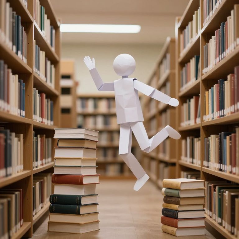 Photograph of a white paper doll with a round head, simple limbs, and no facial features, leaping between two stacks of books in a library. The doll is positioned mid-air, with one arm raised and one leg bent. The stacks of books are on the left and right sides of the aisle, leading to a blurry background of more bookshelves. The library has wooden shelves filled with books of various colors, under bright fluorescent lighting. The scene is whimsical and surreal, with the paper doll adding a playful element to the orderly library setting.