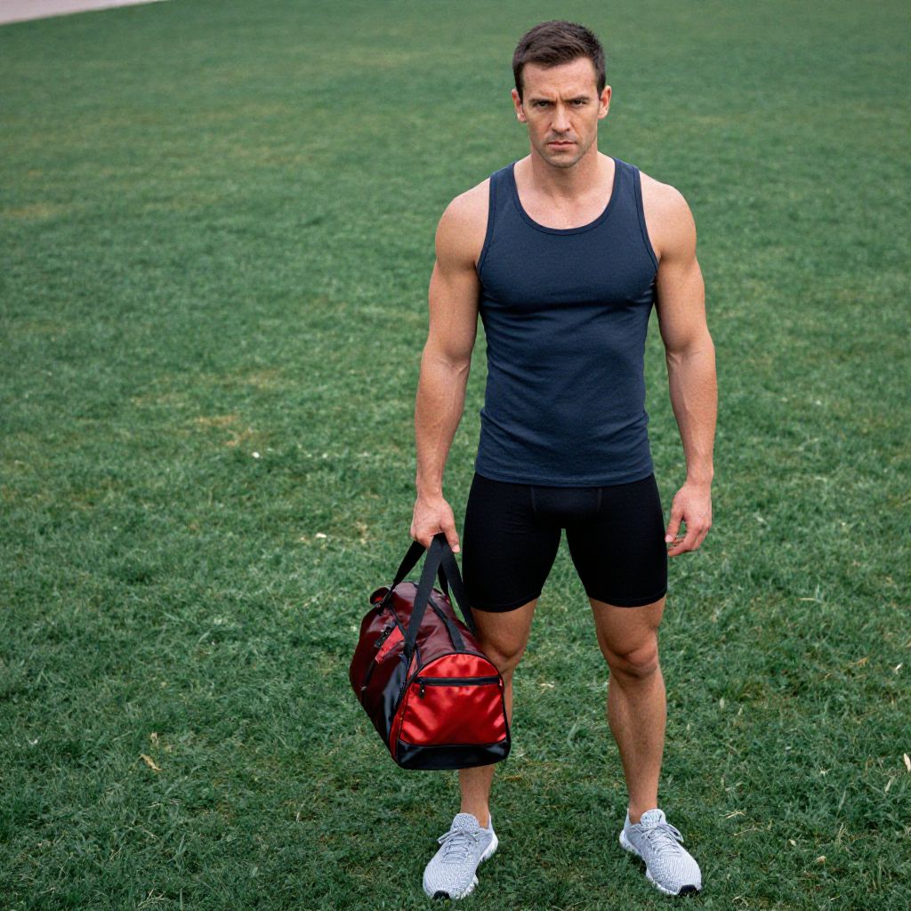 A man, fitted moisture-wicking tank top, black compression shorts, lightweight mesh sneakers, breathable nylon gym bag, vibrant red accents, sprawling green lawns, anscochrome analog film, focused expression Man has masculine face and piercing eyes