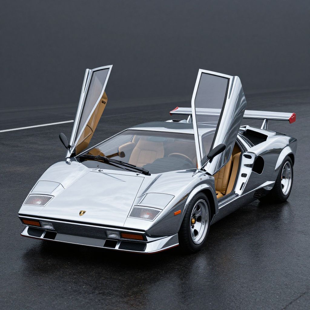 "Compositing highly detailed realistic chrome futuristic Lamborghini countach with open doors on a wet tarmac, RTX, Leica, intricate details, raytracing, photography, photorealistic, elegant,"