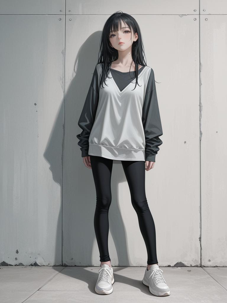 1girl, realistic face, full body shot, Woman, color block, oversized button-up shirt with pastel shades of pink, green, and yellow, drop shoulder, long cuffed sleeves, black relaxed-fit trousers, no visible shoes, minimal jewelry with a delicate necklace, curly mid-length hair, neutral studio background