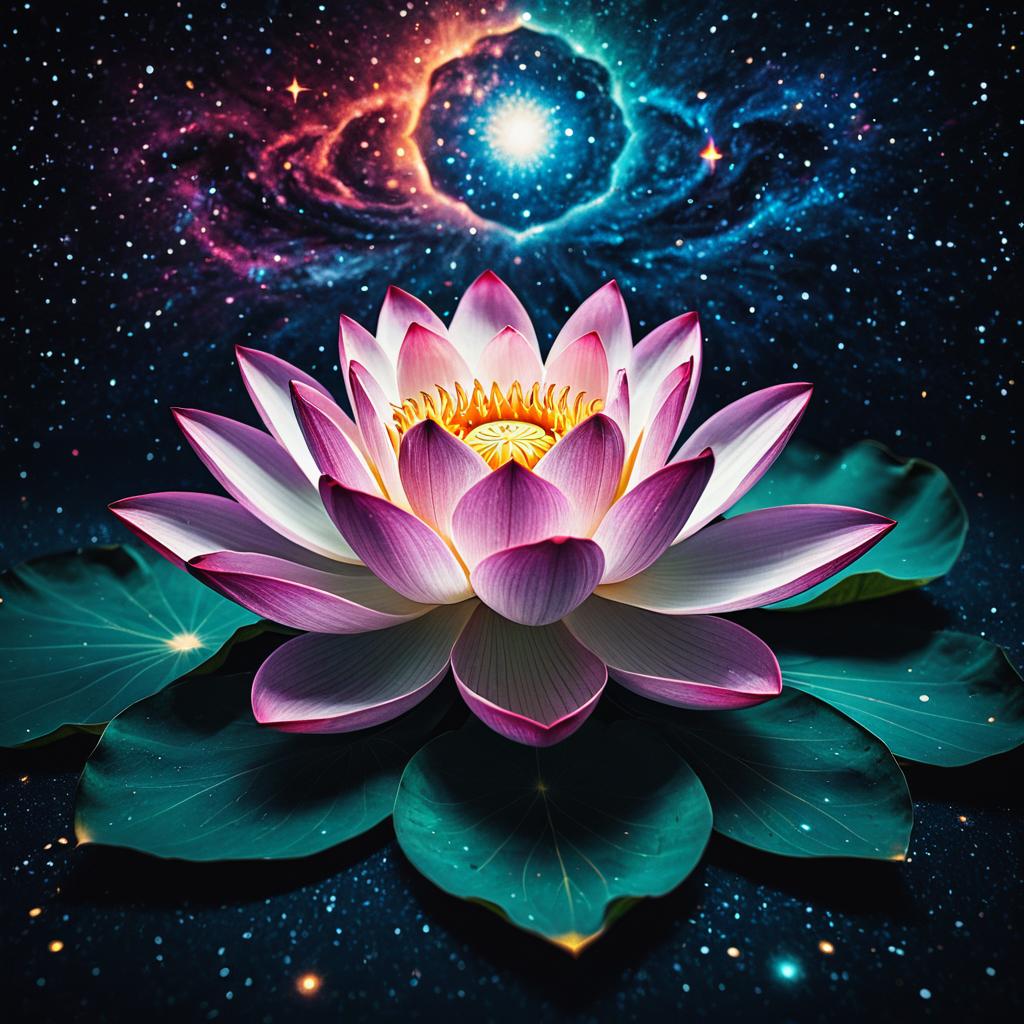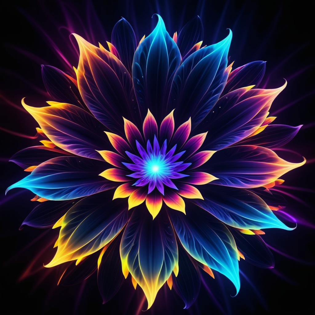 A digital illustration of a vibrant alien flower with intensely glowing multicolored petals in shades of blue, purple, orange, and yellow against a dark background. The layered petals create a luminous and intricate floral pattern that appears otherworldly and radiates vivid colors.