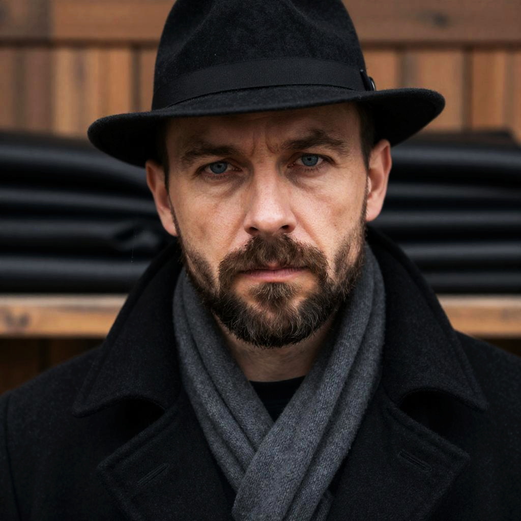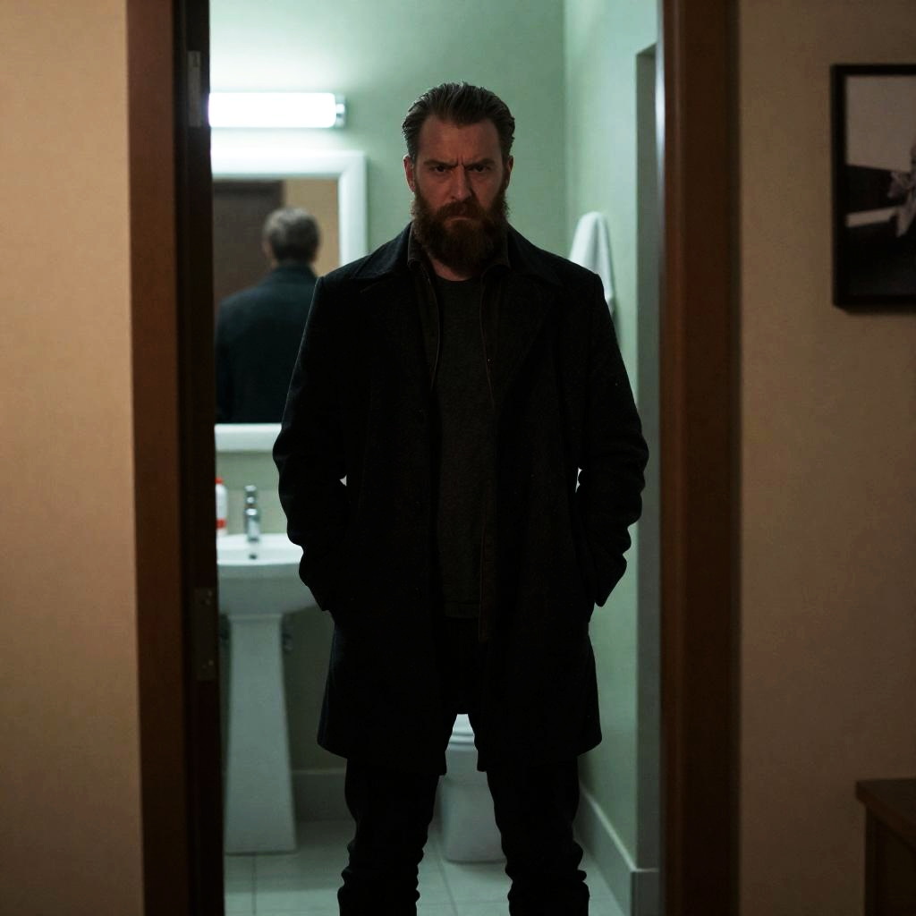Bearded man in dark overcoat standing in dimly lit hallway. Hands in pockets. Background shows green-lit bathroom with toiletries. Doorframe on left, wall with picture on right. Intense expression. Number of people: 1.