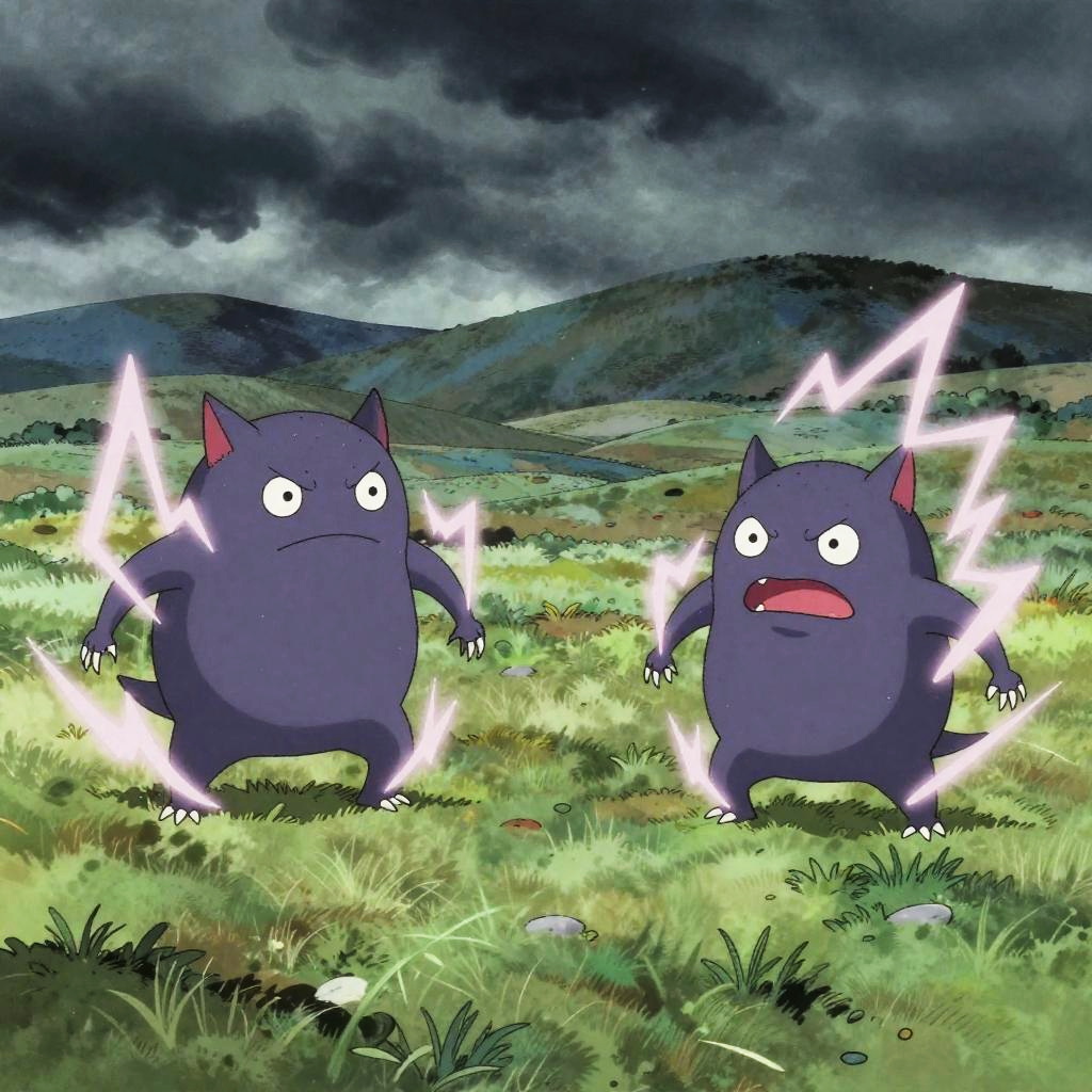 A trio of jolly river spirits, each with fluid forms and sparkling droplets, causing playful splashes along the water's edge, in a flowing river surrounded by moss-covered rocks, drawn in the whimsical and spooky anime style of Shigeru Mizuki.