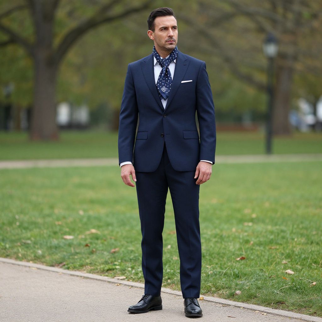 Stylish Man Outfit Costume, man wearing a suit and scarf standing in a park
