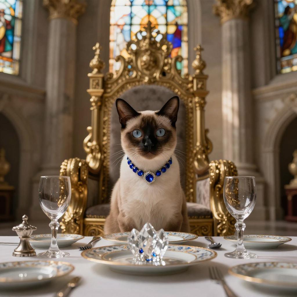 Sleek Siamese cat with sapphire collar seated at a fine dining table in a tyrannical throne room with towering stone pillars, with crystal and porcelain plateware, f/1.4 200mm zoom shallow depth of field, ultra sharp photograph, (Golden hour sunlight filtering through stained glass windows:1.2) (masterpiece:1.2) (photorealistic:1.2) (bokeh) (best quality) (intricate) (8k) (HDR) (cinematic lighting) (sharp focus)