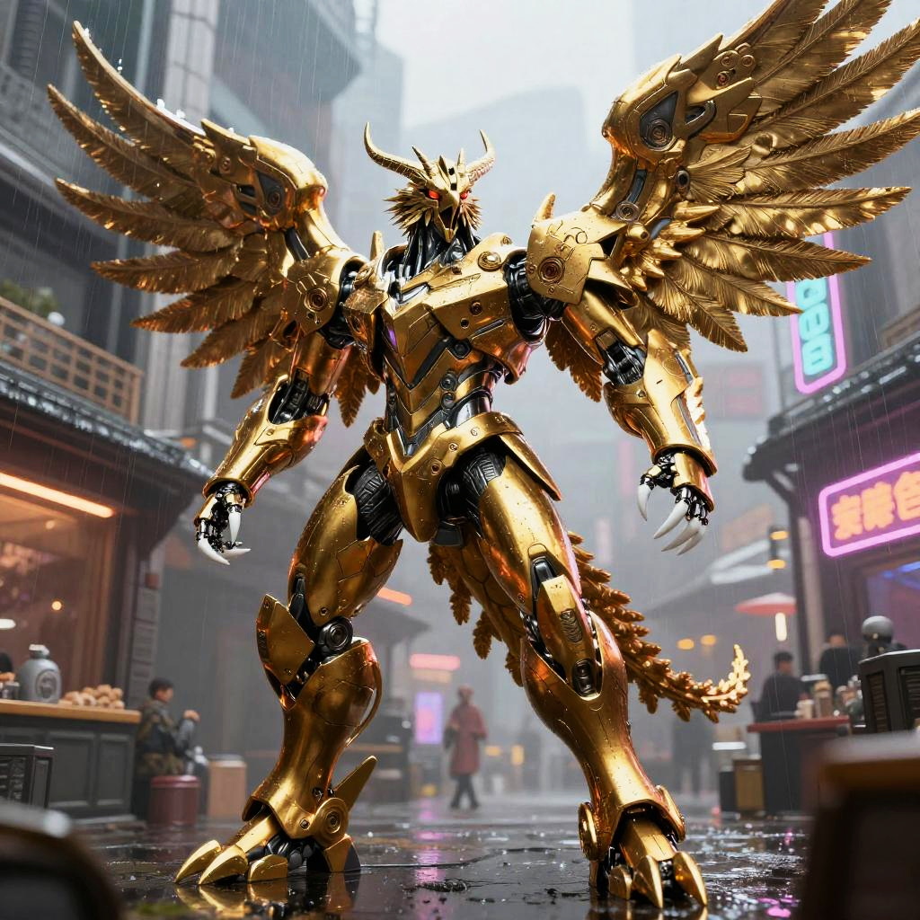 Anthro gold-plated phoenix robot, ((lineart)), membranous wings, horns, tail, red eyes, white claws, muscular solo, standing, fighting stance, huge mecha presence, no humans, science fiction, rain-soaked futuristic marketplace, dramatic low side angle, pwide shot, neon glow lighting, 8k wallpaper, RAW photo, best quality, masterpiece, realistic, photo-realistic, mecha (mjstyle), (robot:1.5), (porcelain materials:1.6), (polished metal:1.4)