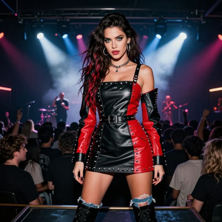 A stunning female rock star wearing a bold and vibrant rock star outfit, including a leather mini dress with metallic studs, a black and red cropped jacket with exposed shoulders, ripped denim pants, and combat boots. She has long, wavy dark brown hair with a few streaks of red, fierce green eyes, and a confident, electrifying expression. The setting is a dimly lit underground music club during a live concert, with flashing stage lights, smoke machines, and a packed crowd in the background.