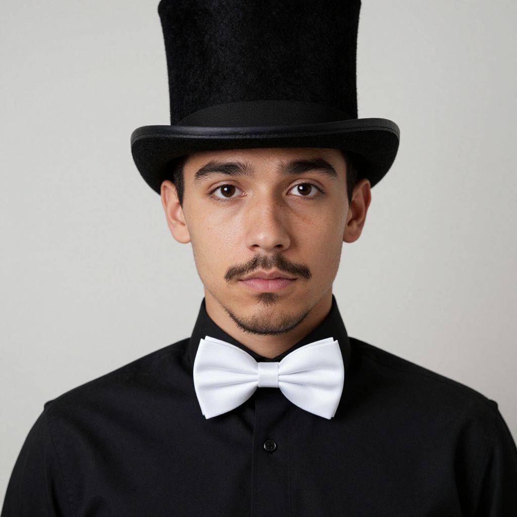 Photograph of a man with a mustache, white suit, black cape, black boots, golden crown, and black bow tie, standing confidently against