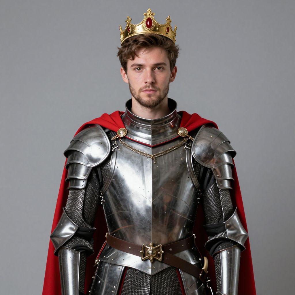Photograph of a man with a trimmed mustache, wearing a gold crown, white tuxedo, black bowtie, and black cape. He stands confidently with hands on hips, black boots, and a neutral beige background. The cape is long, flowing, and contrasts sharply with the white tuxedo. The man's expression is serious, and he gazes directly at the camera. The image has a clean, studio-like quality, emphasizing the regal yet modern attire.