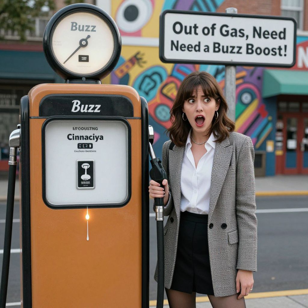 Imagine a woman dressed in modern, chic attire standing beside a vintage gas pump that reads \"Buzz\" instead of fuel, The pump’s gauge is almost empty, with a small drip of glowing liquid about to fall, She’s holding the nozzle with a playful, exaggerated look of panic, as if she’s running out of creative energy, The sign above the pump humorously reads: “Out of Gas, Need a Buzz Boost!” The backdrop is an artistic cityscape with murals and street art, reflecting creativity, The scene combines humor and urgency with a stylish, relatable vibe